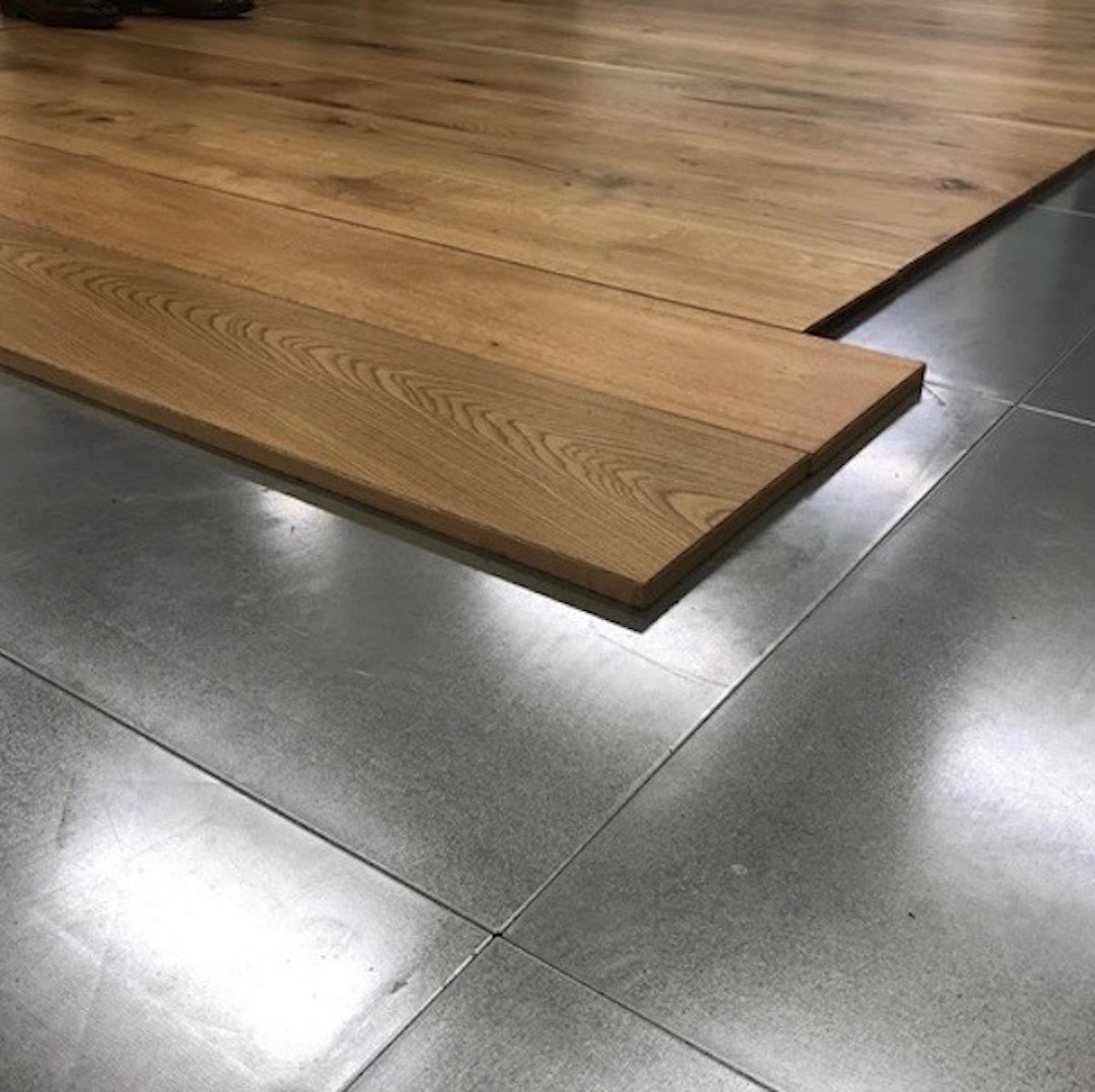 PETRALWood is a self-laying magnetic floor covering in genuine natural wood. It comprises a noble oak surface layer over a core of phenolic birch plywood and a base layer consisting of a mix of thermoplastic resin and magnetically charged ferrite. PETRALWood is formed in thin planks and tiles, treated, stained, finished in protective oils or wear-resistant varnish and squared to a fine tolerance. The edges are protected against humidity and slightly chamfered for easy installation.